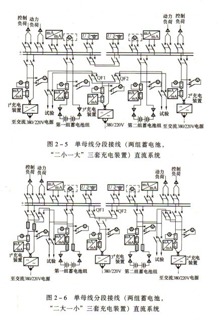 圖2-3單母線分段接線(一組蓄電池,兩套充電裝置)直流系統負荷停電。每段母線獨立設一套絕緣監察裝置和電壓監視裝置。適用范圍:中小容量發電廠和220kV及以下較重要變電所。