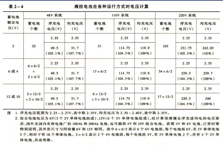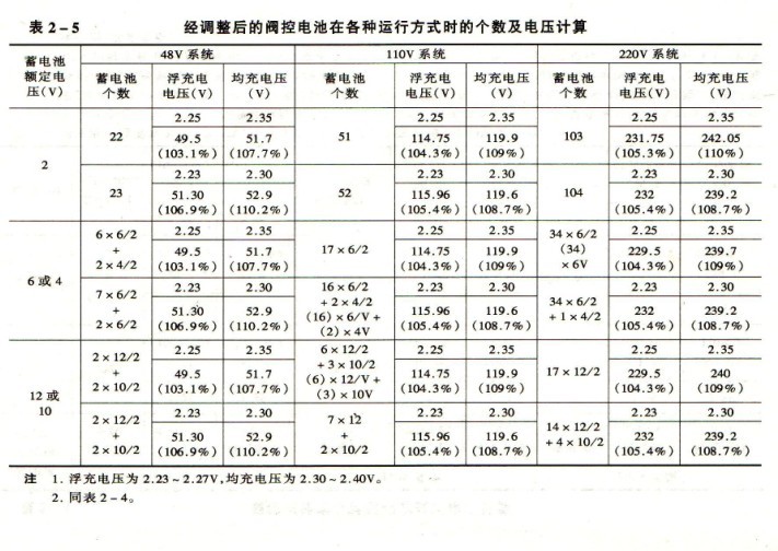 (2)蓄電池的個數均少于一般鉛酸蓄電池個數,對減少安裝與試驗工作、減少工程投資都較有利。根據表2-4,每個電池浮充電壓按2.25V,均衡充電電壓2.35V計算。母線電壓有個別情況要求偏移電壓范圍較大。為此,可將浮充電電壓作少量增減,對均充電壓由2.35V降至2.30V,均充時間可能略為延長一些。據一些電池廠試驗,延長2~3h,即可達到均衡充電要求。經調整后的電池個數與電壓的計算,見表2-5。