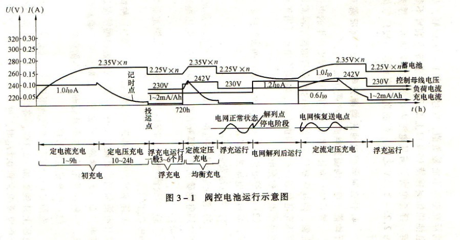 閥控電池組完成初充電后,即可轉為浮充電方式運行。對于變(配)電所只有一組蓄電池時,浮充電就是充電裝置首先應滿足直流負荷的要求,另外還要以小電流滿足電內部的自放電要求。所以浮充電電流值等于直流負荷電流+浮充電流。浮充電補償電池內部的自放電和外殼表面臟污后所產生的爬電損失。除直流負荷電流外,真正充進電池內