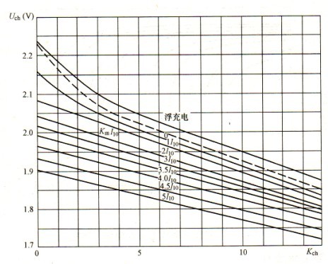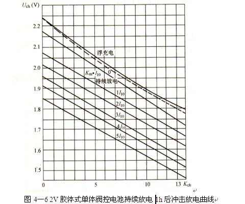圖4—5~圖4—7中,浮充電曲線是指電池與充電裝置并聯(lián)運行時,承受短時間沖擊放電電流時蓄電池的端電壓,其中實線為電池未脫離浮充系統(tǒng)的端電壓,虛線為電池剛脫離浮充系統(tǒng)的電壓,持續(xù)放電曲線是指不同放電電流時,承受第三時間沖擊放電的電壓變化曲線,沖擊放電曲線的沖擊時間為10~15s。曲線中“0”曲線是電池完全充足電后,脫離充電系統(tǒng),待電池電壓下降且穩(wěn)定在2.06~2.IOV/個時,進行沖擊放電的電壓變化曲線。
