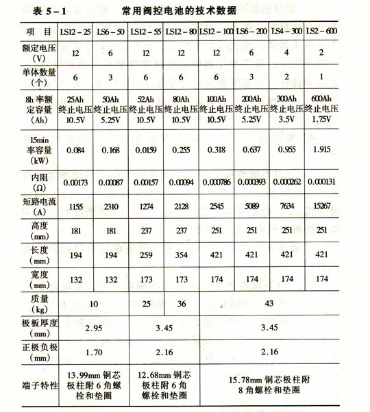 電池的內阻就單體電池而言,主要由電解液、隔板和極板本身(極柵及活性物質)構成。就電池組而言,單體電池之間的連接,以及極柱都是構成電阻的重要部分,需進行電壓降的計算。有時為了減小電壓降的損失,而采用銅芯鍍鉛的極柱。常用閥控電池的技術數據見表5—1。